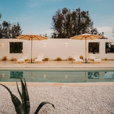 There is a set of sun loungers, deck chairs, tables and pergolas for the shade just by the pool side.