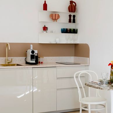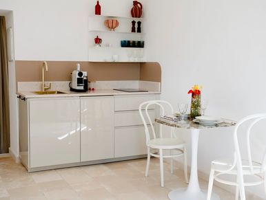 The mini kitchen is small, but has it all. Nespresso coffee maker, fridge, microwave, two zone induction plate and even a small dishwasher.