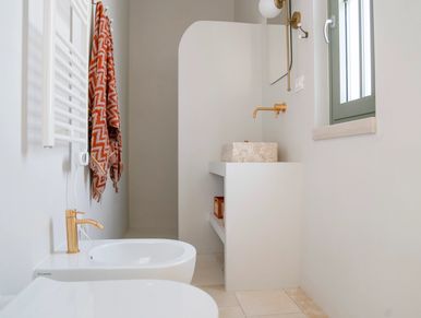 This bathroom is equipped with the highest quality materials, walk in shower, electric towel rack and behind a partition is a washing machine at your disposal.